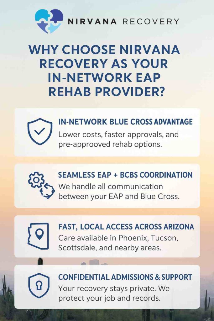 When you’re using your Blue Cross Blue Shield EAP benefits for rehab in Arizona, where you go for treatment matters, as an in-network provider, Nirvana Recovery makes the process easier from referrals to admission. We handle the details so you can focus on getting better.